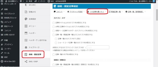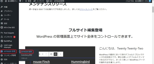 「WordPressのトップページ」➡「AFINGER管理」➡「AFINGER管理」