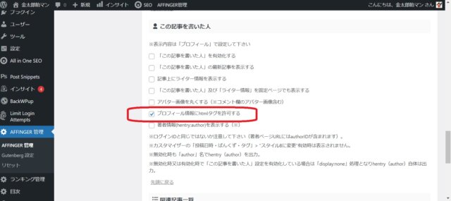 「プロフィール段落にHTMLタグを許可する」にチェック
